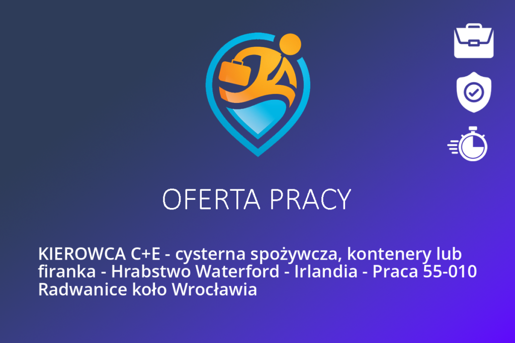 Źródłowe ogłoszenie: https://jobtime.pl/praca/110134/KIEROWCA-CE—cysterna-spozywcza-kontenery-lub-firanka—Hrabstwo-Waterford—Irlandia.html