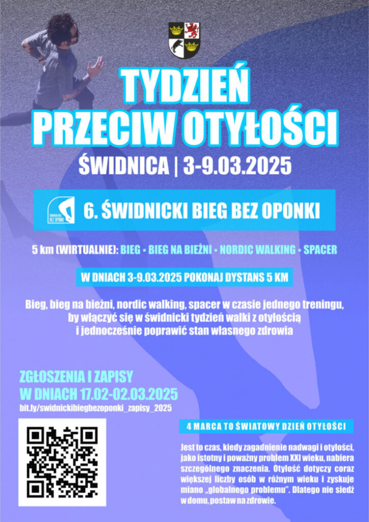 Zapraszamy do udziału w szóstej edycji wirtualnego biegu „Świdnicki Bieg Bez Oponki”. W ciągu tygodnia, od 3 do 9 marca, Twoim zadaniem jest pokonanie co najmniej 5 km podczas jednego treningu. Możesz wybrać dowolną formę aktywności, taką jak bieg, bieg na bieżni, nordic walking lub spacer. To doskonała okazja, aby rozpocząć swoją przygodę z aktywnością fizyczną i zdrowym stylem życia, a także pozbyć się zbędnych kilogramów.