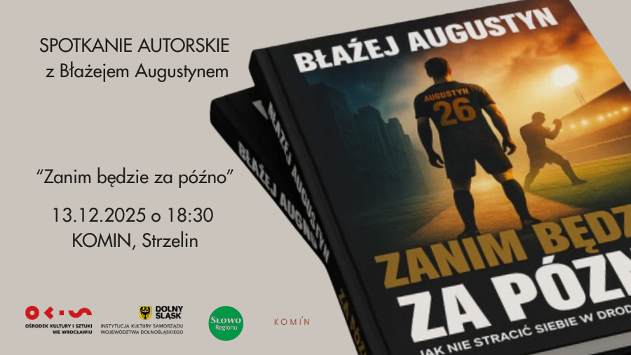 Serdecznie zapraszamy na spotkanie z autorem Błażejem Augustynem poświęcone jego książce „Zanim będzie za późno”. Wydarzenie odbędzie się w sobotę, 13 grudnia 2025 r. o godz. 18:30 w Kominie w Strzelinie. Wstęp jest bezpłatny.
